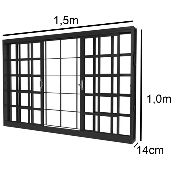 - Material: aço carbono laminado. - Pintura: fundo primer a base solvente. - Abertura: Janela De Correr. - Tamanho (LxAxP): 150cm X 100cm X 14cm.